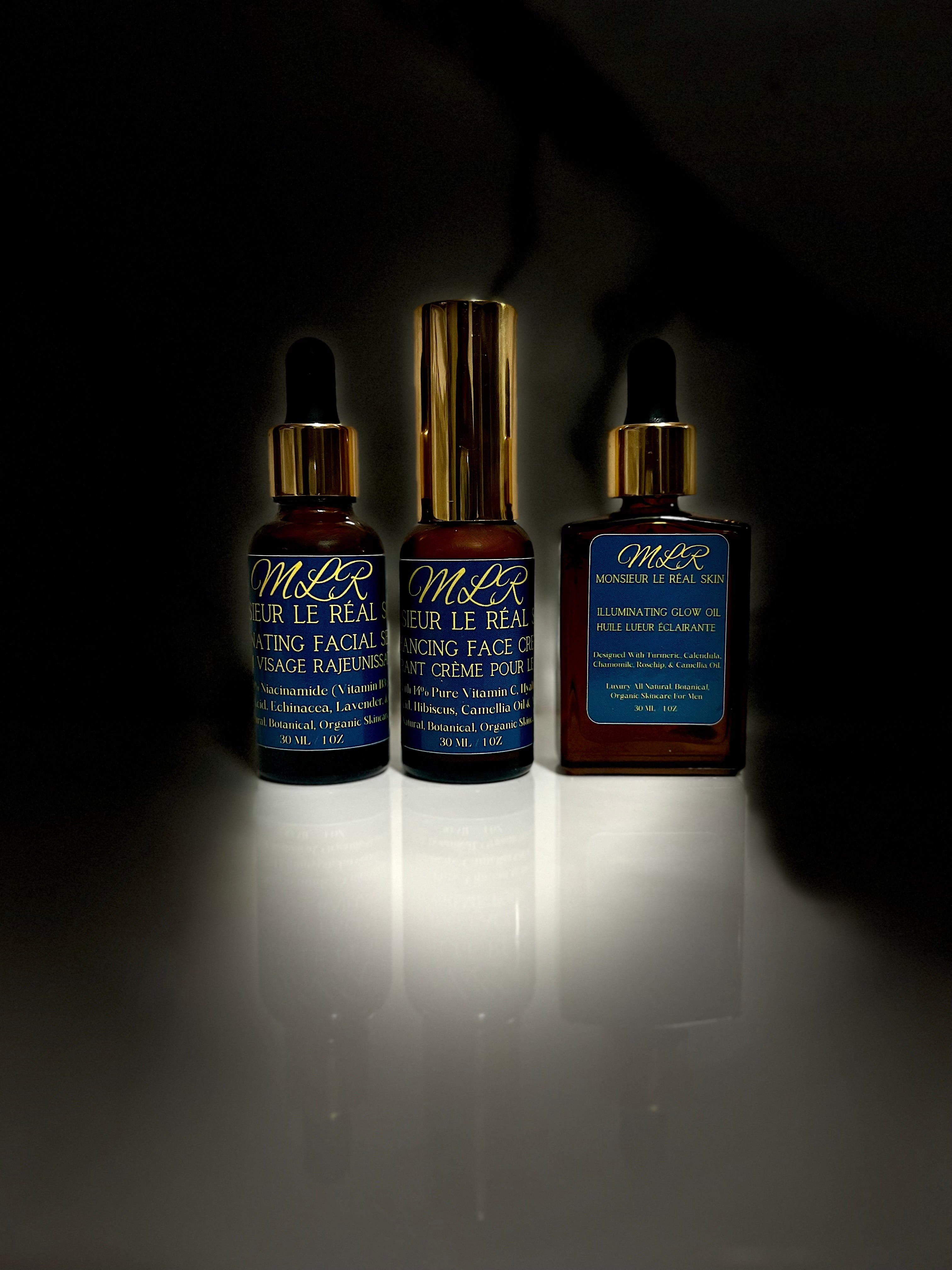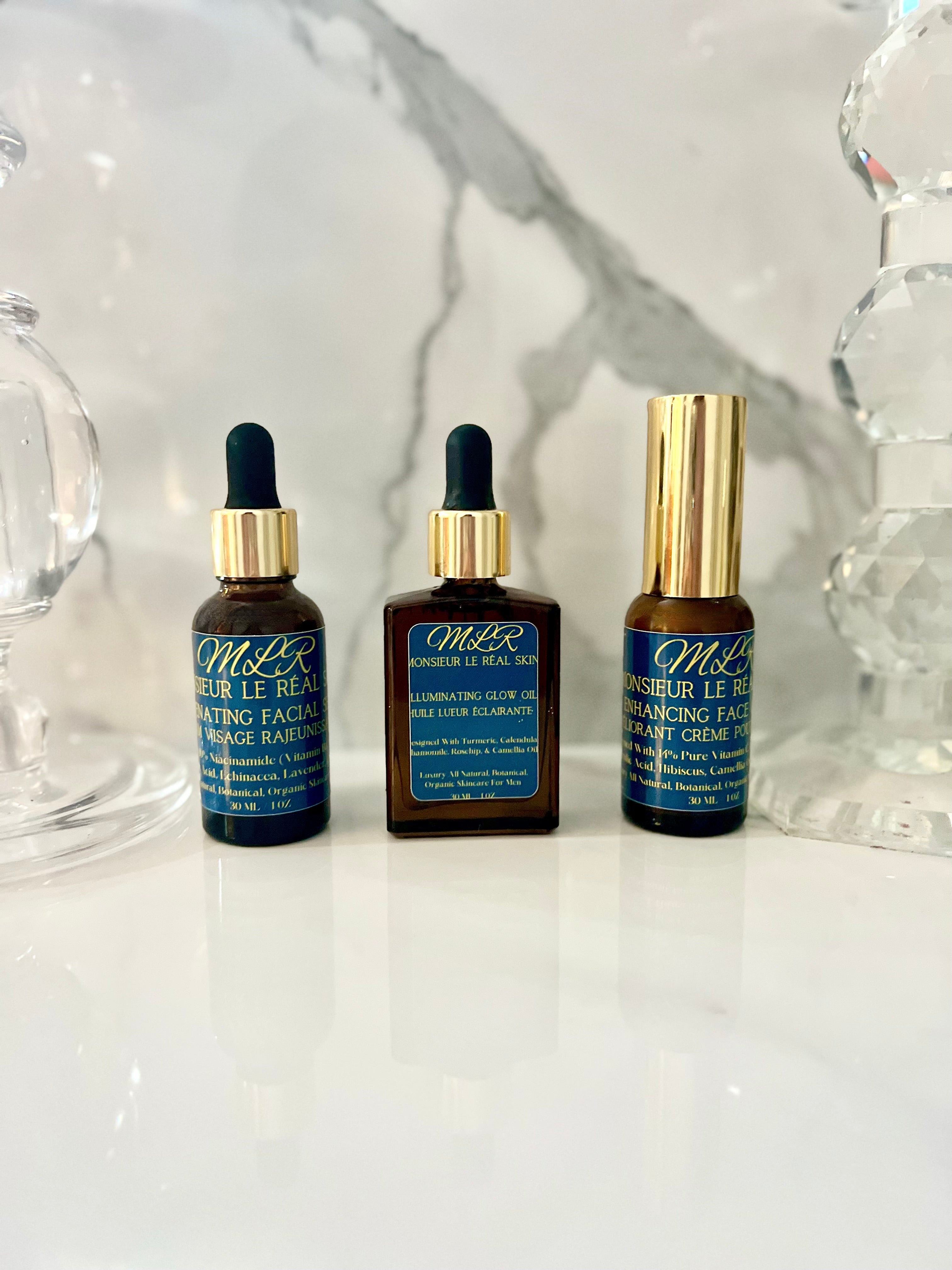The Monsieur Le Réal SKIN Revolutionizing 3-Step Facial Set combines all of our revolutionizing facial skincare products into the ultimate 3-Step facial skincare routine. This skincare set includes Monsieur Le Réal SKIN Rejuvenating Facial Serum, Monsieur Le Réal SKIN Enhancing Face Cream, & Monsieur Le Réal SKIN Illuminating Glow Oilproviding the absolute best benefits to your skin.