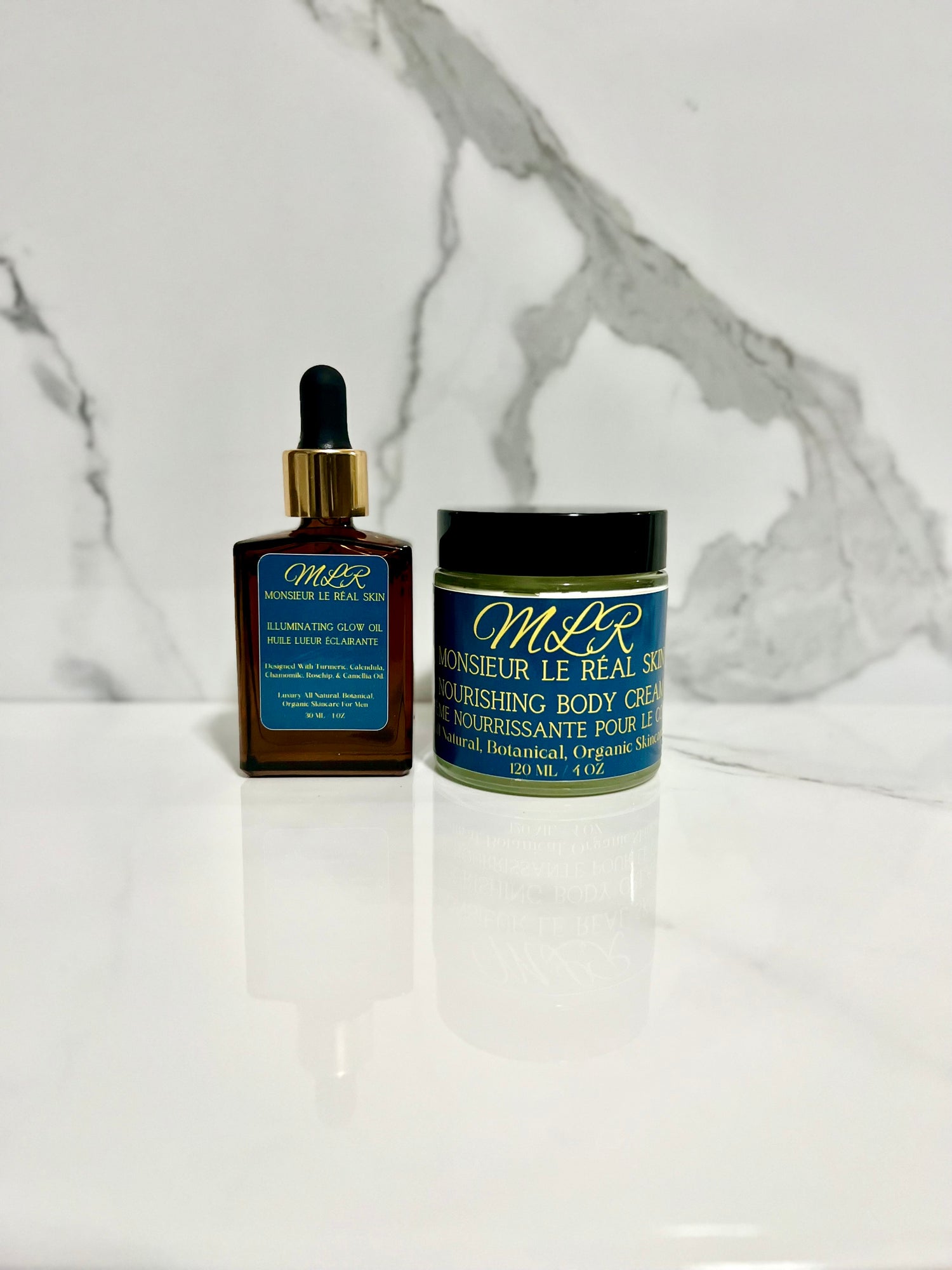The Monsieur Le Réal SKIN Body skincare line was crafted with the goal to nourish, moisturize, heal, and brighten the skin. For the ultimate transformation, use both products in your daily skincare routine. Begin with the Nourishing Body Cream and complete with the Illuminating Glow Oil.