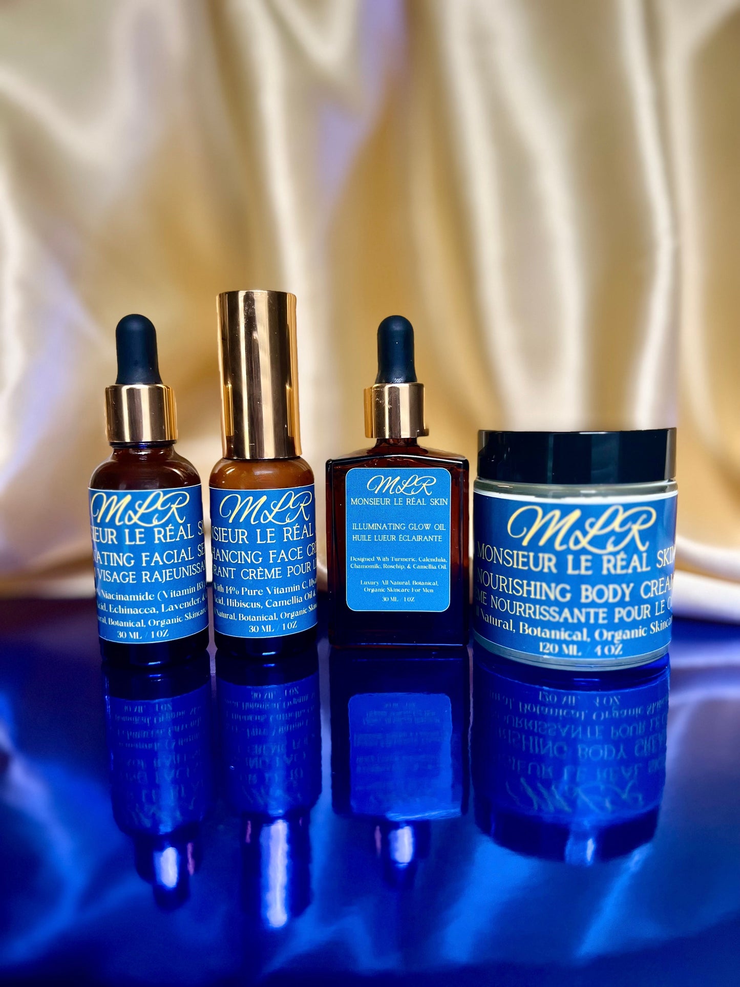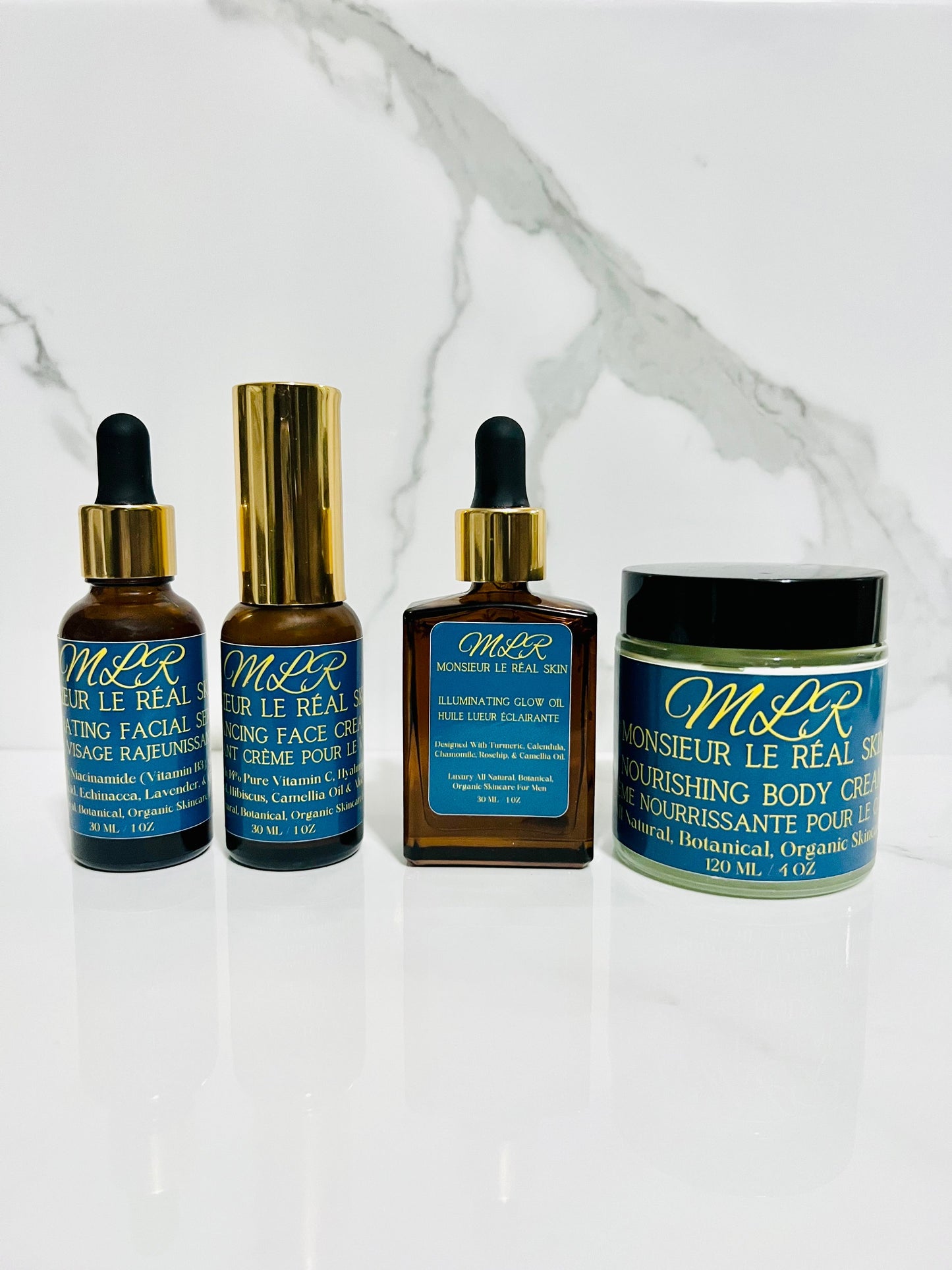 The Monsieur Le Réal SKIN Revolutionizing All-Inclusive Skincare Set includes all Monsieur Le Réal SKIN Revolutionizing skincare products into the most transformative skincare set. This skincare set includes Monsieur Le Réal SKIN Rejuvenating Facial Serum, Monsieur Le Réal SKIN Enhancing Face Cream, Monsieur Le Réal SKIN Illuminating Glow Oil, & Monsieur Le Réal SKIN Nourishing Body Cream offering the finest benefits to you skin.