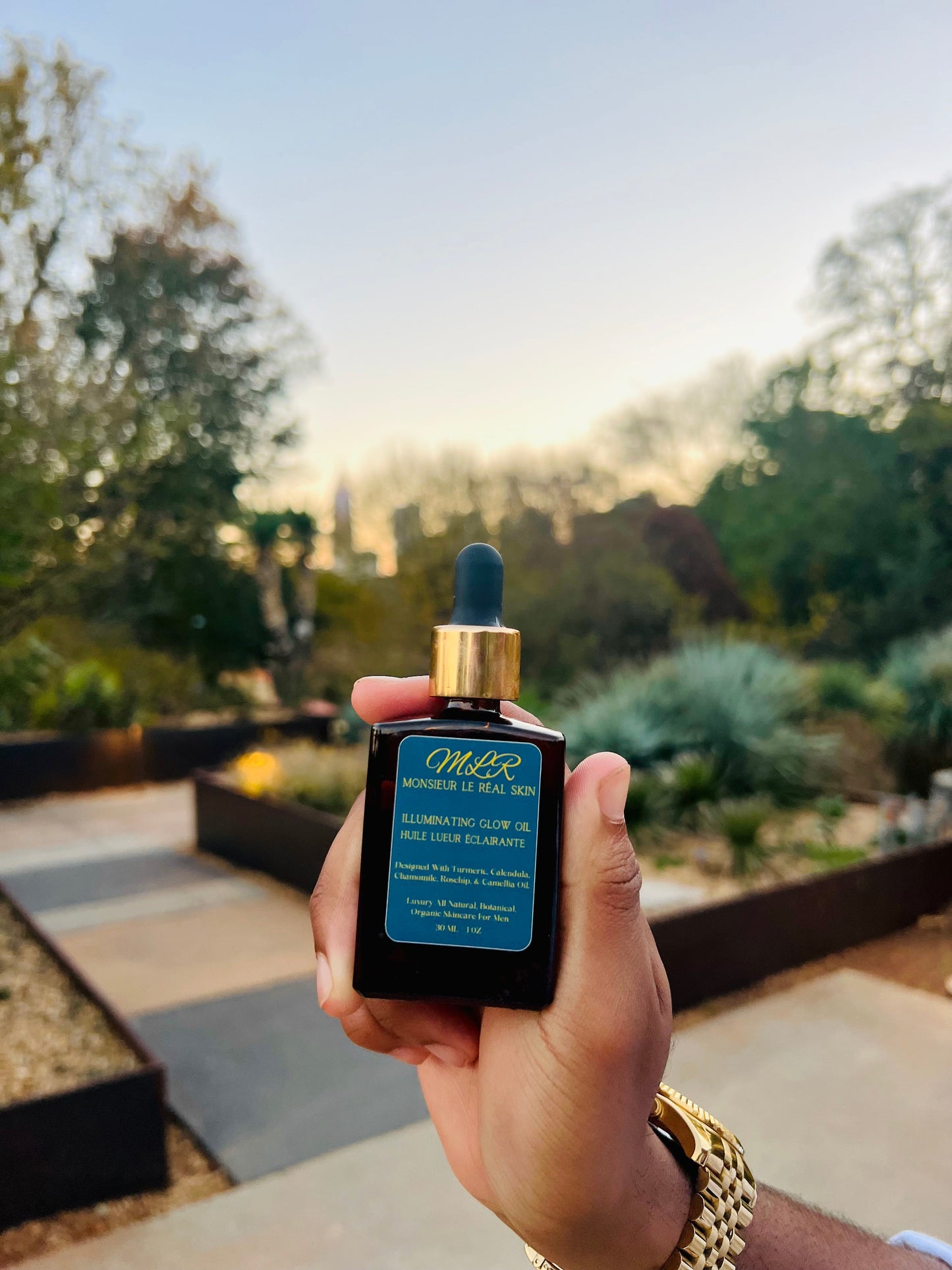 The Monsieur Le Réal SKIN Illuminating Glow Oil is designed with all natural and organic ingredients including Turmeric, Calendula, Chamomile, and Hibiscus to enhance the appearance & smooth the texture of skin by providing powerful antioxidants, Vitamins A,B,C, D, & E, and anti-inflammatory & brightening proprieties. The Illuminating Glow Oil formula is quick-absorbing, non-comedogenic, and made without tree nut oils perfect for all skin types to use. The Illuminating Glow can be used as a pre shave oil. Using this oil before beginning your shaving routine can help soften your skin and help limit irritation. Also use the oil as a moisturizer once your complete your shaving routine. Designed with Turmeric, Calendula, Chamomile, Vitamin E & Camellia Oil. 30ml | 1oz